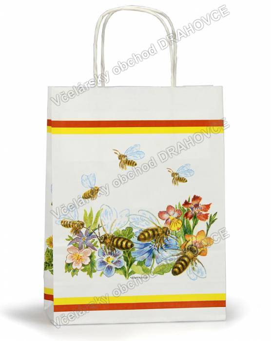 Biela papierová darčeková taška so vzorom "včielky a kvety".