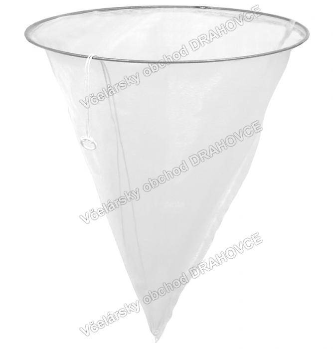 Uhelonový cedník na cedenie medu so šňúrkou na uvoľnenie vosku a iných nečistôt, ktoré pri cedení upchávajú cedník v jeho spodnej časti.