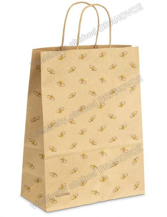 Hnedá papierová darčeková taška so vzorom "včielky". Točené ušká dodávajú taštičkám luxusnejší vzhľad.