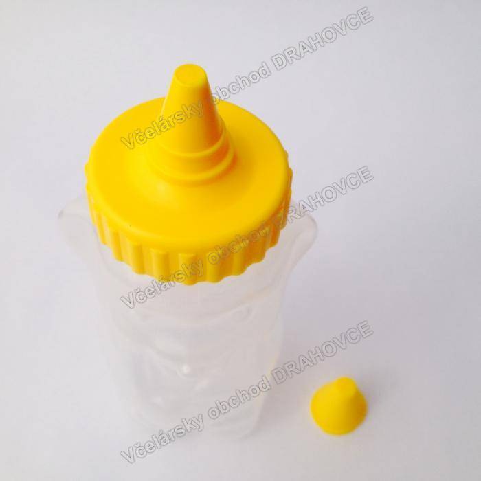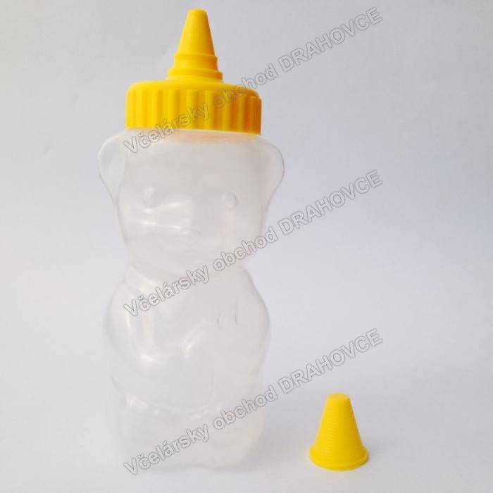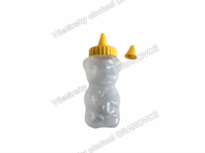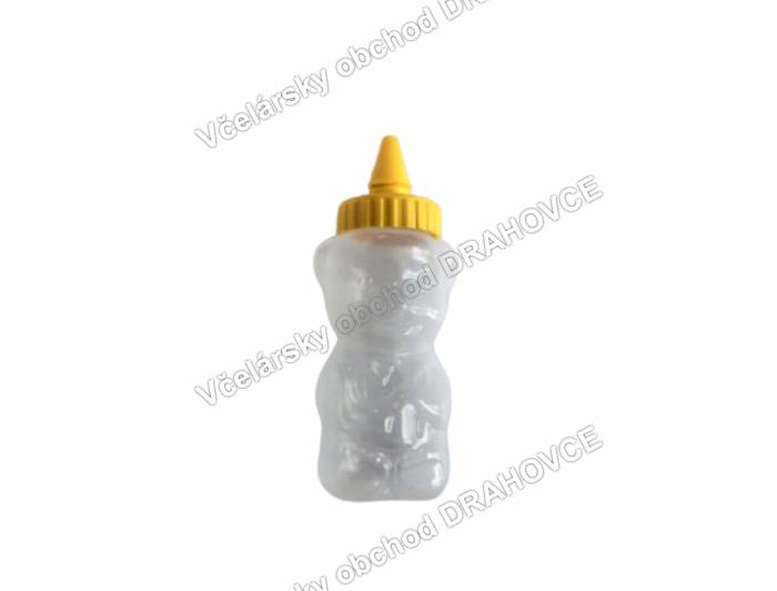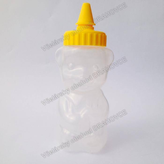 Plastový obal na med v tvare medveďa na 250g medu. Vyrobený je z potravinárskeho polyetylénu vhodného pre styk s potravinami. Použitie je veľmi jednoduché. Naplníte medom a nasadíte uzáver. Krútenim v smere hodinovych ručiciek pritiahnete uzáver. Pred použitim odstránite krytku a odrežete špičku. Doporučujeme odrezať viac zo špičky pri hustejších medoch.