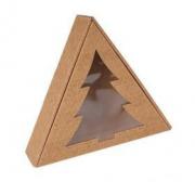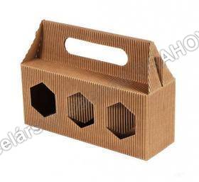 Darčeková krabička z vlnitej lepenky na 3 menšie poháre medu. Tri okienka v tvare hexagónu, ktorých výrezy zároveň slúžia ako prepážka medzi pohármi.