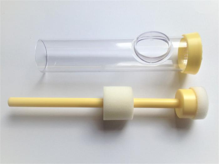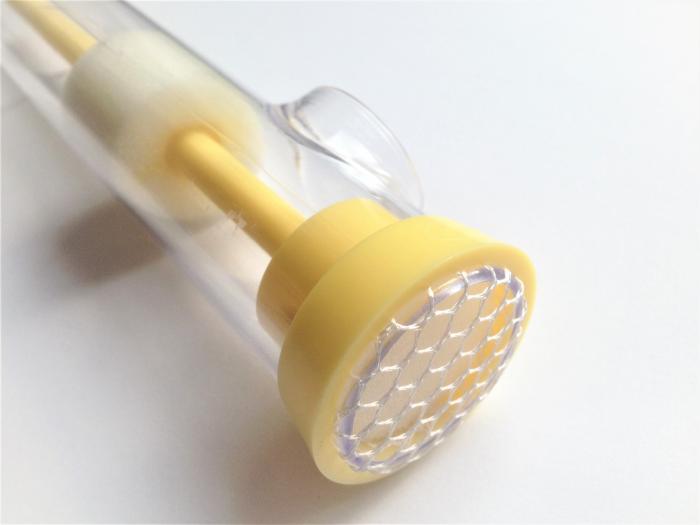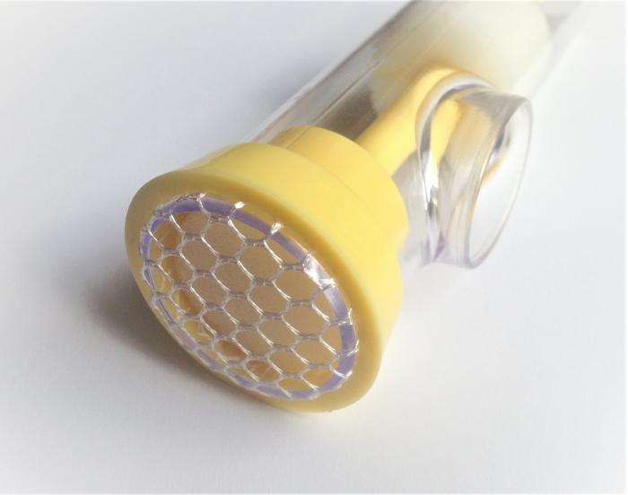 Trubička na chytenie a označenie včelej matky s bočným vstupným otvorom. Na konci trubičky je textilná sieťka (nie plastová mriežka), ktorá umožňuje presnejšie označenie matky a lepší prístup k nej.