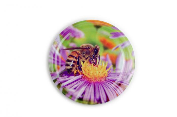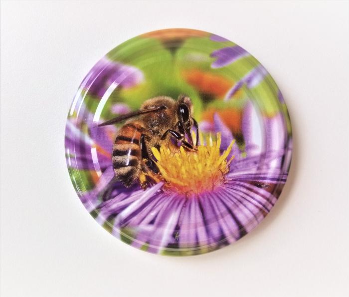 Kovový vrchnák s potlačou včielka na kvete.